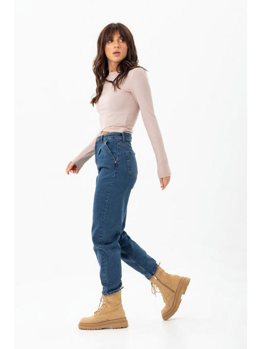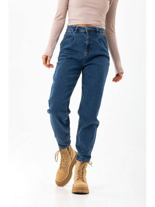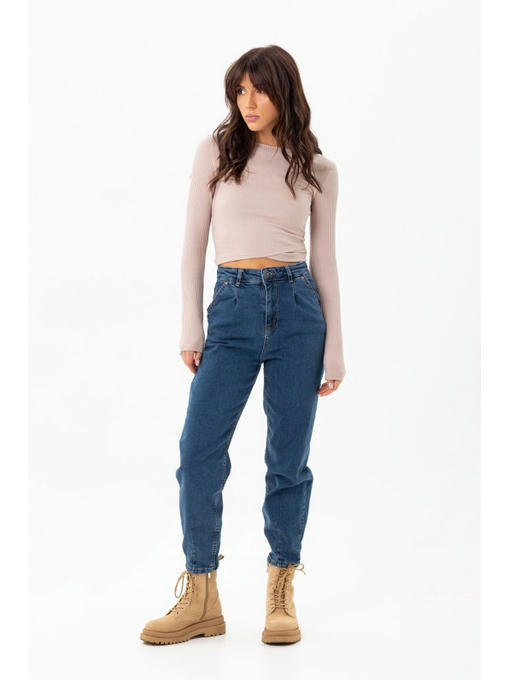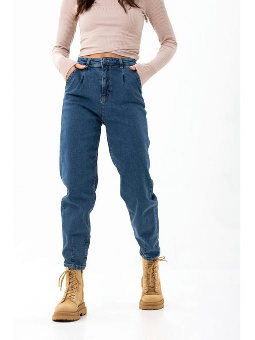 Джинсы бананы изготовлены из качественной джинсы. Модель свободна в бедрах, сужается к низу. Есть мягкие складки у талии. Внизу штанин есть интересные вытачки. Обычные карманы и накладные карманы сзади. Джинсы-бананы застегиваются на молнию и металлическую пуговицу.
