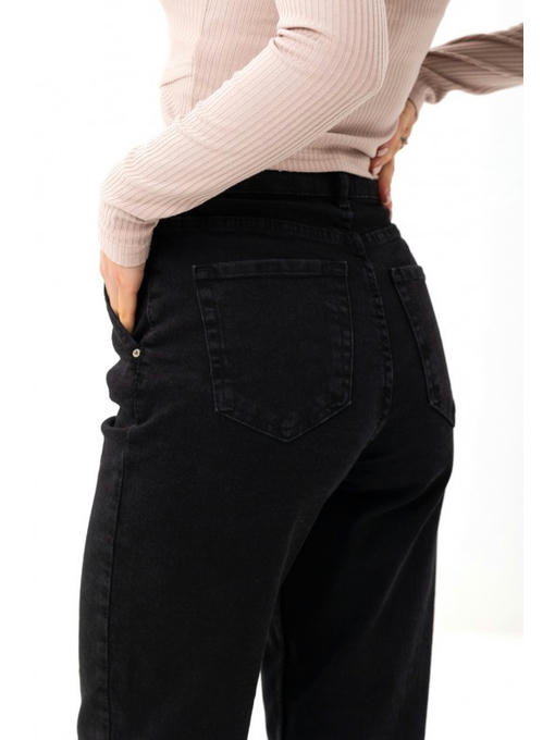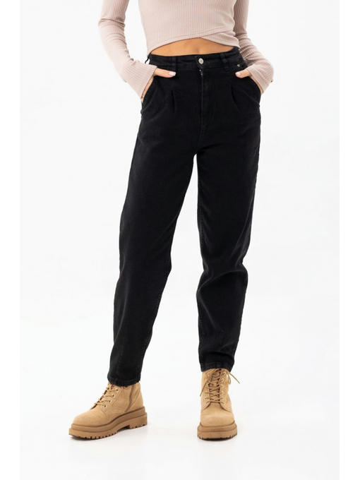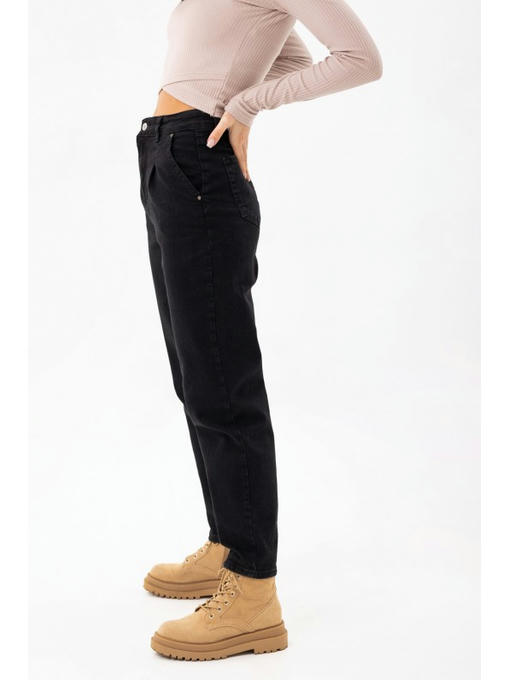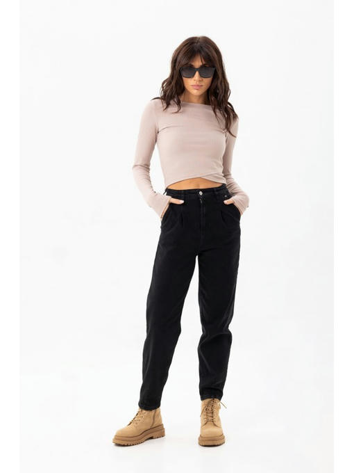 Джинсы бананы изготовлены из качественной джинсы. Модель свободна в бедрах, сужается к низу. Есть мягкие складки у талии. Внизу штанин есть интересные вытачки. Обычные карманы и накладные карманы сзади. Джинсы-бананы застегиваются на молнию и металлическую пуговицу.
