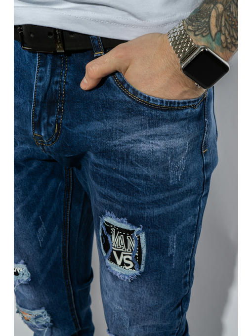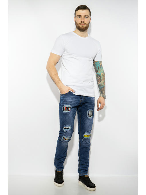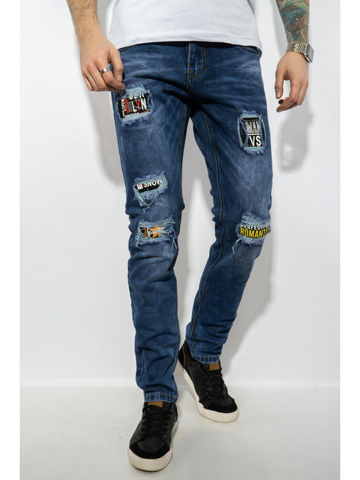 Интересные по дизайну мужские джинсы зауженного фасона, в местах потертостей оригинально декорированы латками из контрастной ткани с яркими принтами. Стильный образ изделия, удачно дополняет расположенная на заднем кармане нашивка. Данная модель, прекрасно подходит тем, кто хочет продемонстрировать свою индивидуальность.