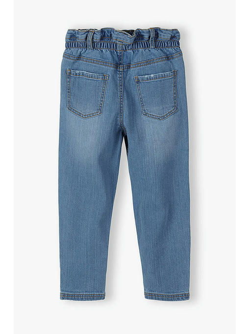 Синие джинсовые брюки для девочки. Выполнены из качественной хлопковой ткани с добавлением эластана, благодаря чему джинсы хорошо тянутся, не сдавливают тело ребенка, приятны на ощупь, поэтому обеспечивают максимальный комфорт. Талия брюк на резинке, что позволяет легко и быстро надеть брюки. Спереди два удобных кармана с отрезным бочком, сзади два накладных кармана. Рядом с карманом имеется небольшой цветочный принт. Эти джинсы для девочки будут идеально смотреться с белой или розовой футболкой