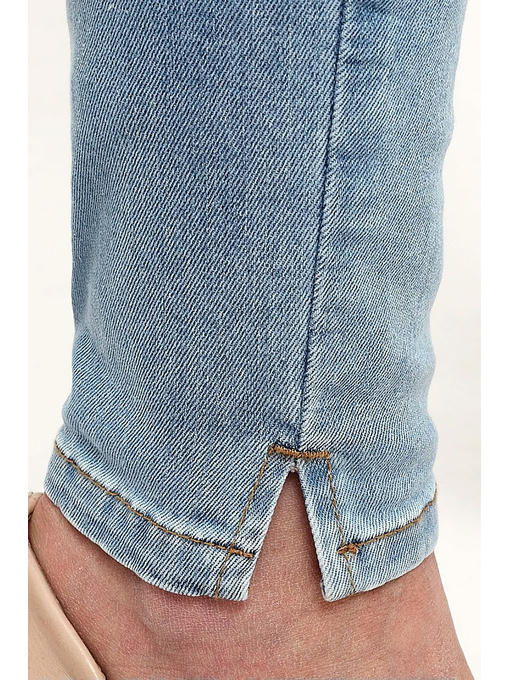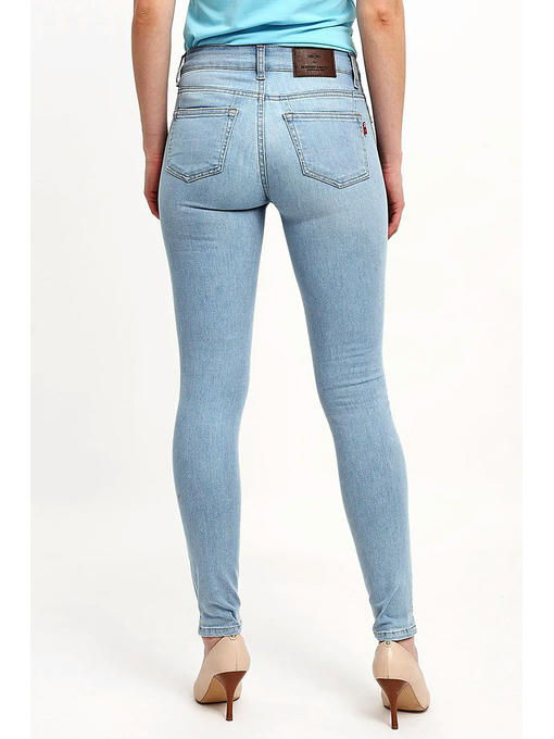 Женские модные джинсы с пятью карманами. Посадка Skinny fit (сильно облегающие по бедру) с высокой талией. Для создания улучшенной посадки на фигуре разработана специальная конструкция задних половинок с двумя выточками под кокетками . Застежка на молнии. Узкие по низу с небольшим разрезом (4 см) по боковым швам. Выполнены из эластичной ткани denim stretch. Светлая стирка с потертостями и слабо выраженными “усами” спереди и потёртостями сзади. Параметры указаны для размера 28