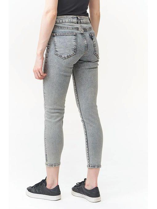 Женские модные джинсы с пятью карманами. Посадка Mom fit (высокая талия), свободные в бедре и зауженные к низу, укороченные (внутренний шов – 67 см). Боковой шов “в разутюжку”, и расстрочен внизу штанины. Застежка на молнию. Оригинальная светлая стирка с заломами по всему полю джинсов. Выполнены из слабоэластичной ткани denim comfort stretch, цвет ткани Blue/Black (лицевая сторона ткани синяя, а изнаночная черная). после стирки имеет голубовато-серый оттенок. Модная фурнитура ограниченной серии. Параметры указаны для размера 28