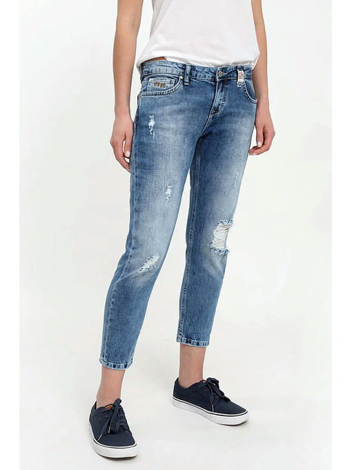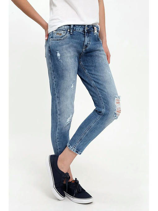 Женские модные джинсы с пятью карманами. Посадка Skinny boyfriend fit, свободные в бедре и зауженные книзу, укороченные (внутренний шов – 67 см). Для улучшения посадки сделан подкройной пояс из 2-х частей. Застежка на молнию. Средняя посадка по талии спереди и высокая сзади. Оригинальная светлая стирка с потёртостями и заломами. Спереди несколько растрепанных дырок, создающих модный эффект поношенности. Выполнены из слабоэластичной ткани denim comfort stretch .Модная фурнитура ограниченной серии. Параметры указаны для размера 28