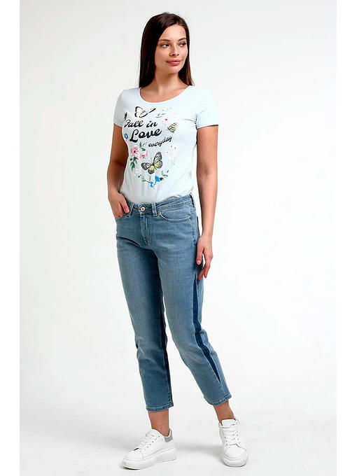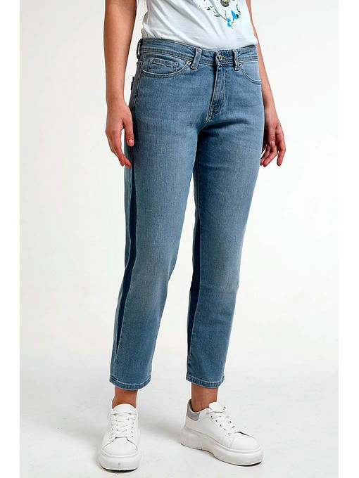 Женские модные джинсы с пятью карманами. Посадка Boyfriend fit. Для улучшения посадки по талии сделан подкройной пояс из 2-х частей. Застежка на молнии. Высокая посадка по талии, зауженные к низу, укороченной длины. Длина внутреннего шва для роста 32 – 69,0 см. Боковой шов “в разутюжку”. По боковому и внутреннему швам сделана имитация вставок темной джинсовой ткани. Выполнены из слабоэластичной ткани denim comfort stretch. Светлая стирка с потёртостями и “усами”спереди и потертостями сзади. Параметры указаны для размера 28
