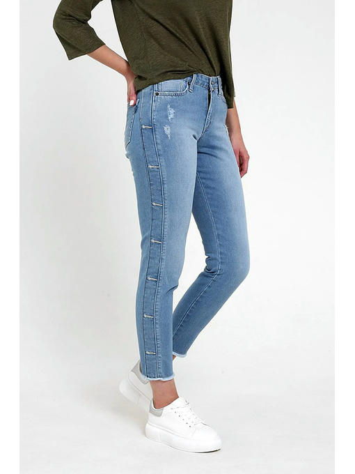 Женские модные джинсы с пятью карманами и дополнительным дизайнерским элементом в виде лампасов по боковым швам. Посадка Boyfriend fit. Для улучшения посадки по талии сделан подкройной пояс из 2-х частей. Застежка на молнии. Средняя высота талии, узкие внизу, укороченной длины, по низу бахрома 1 см.. Выполнены из малоэластичной ткани denim comfort stretch. Светлая стирка с потертостями спереди и сзади. На передних половинках джинсов в нескольких местах сделаны небольшие дырки , а на задних карманах локальные повреждения ткани (“damages”). Параметры указаны для размера 28