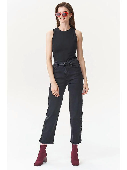 Женские джинсы с пятью карманами и с застежкой на З пуговицы по боковому шву. Посадка Regular fit (полуоблегающие по бедру). Высокая талия спереди и сзади. Застежка на молнии. Широкие по всей длине и немного зауженые к низу. Выполнены из слабоэластичной ткани denim comfort stretch, цвет ткани Black/Black (лицевая и изнаночная стороны ткани черные). Темная стиркас видимыми потортостями по швам. Параметры указаны для размера 28