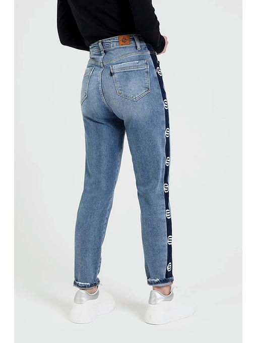 Женские джинсы с лампасами и пятью карманами. Посадка Comfort fit High waist, свободные в бедре и зауженные к низу. Застежка на молнию