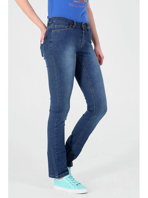 Женские классические джинсы с пятью карманами. Посадка Regular fit (полуоблегающие по бедру), Средняя высота талии спереди и высокая сзади. Для улучшения посадки по талии сделан подкройной пояс из 2-х частей. Застежка на молнии. Прямые к низу. Выполнены из ткани эластичной denim stretch. Средняя стирка с потёртостями спереди и потёртостями сзади. Параметры указаны для размера 28