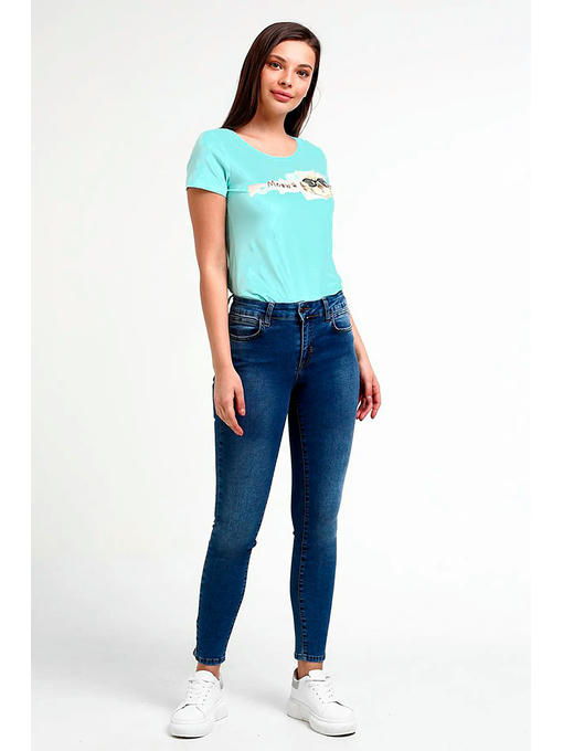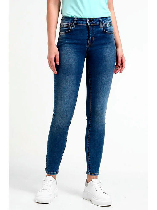 Женские модные джинсы с пятью карманами. Посадка Skinny fit (сильно облегающие по бедру) с высокой талией. Для создания улучшенной посадки на фигуре разработана специальная конструкция задних половинок с двумя вытачками под кокетками. Застежка на молнии. Узкие по низу с небольшим разрезом (4 см) по боковым швам, укороченной длины. Выполнены из эластичной ткани denim stretch. Средняя стирка с потертостями спереди и сзади. Параметры указаны для размера 28. Длина внутреннего шва для роста 32- 74 см, для роста 34 – 79 см