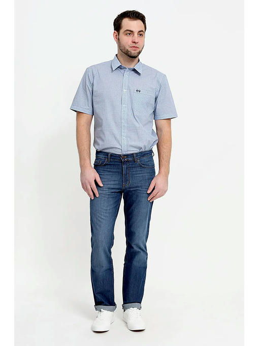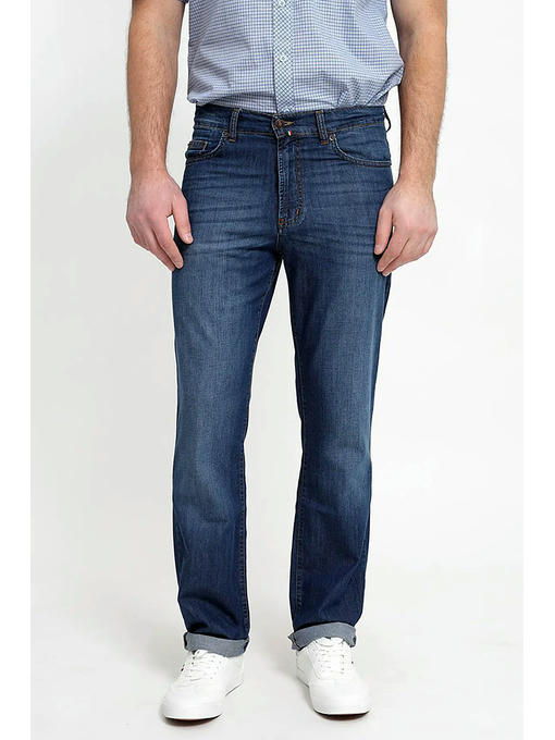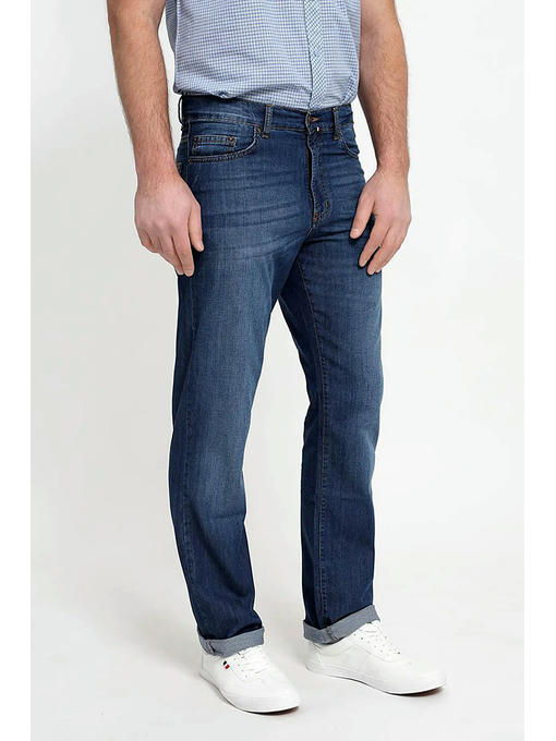 Мужские классические джинсы с пятью карманами. Посадка Regular fit (полуоблегающие по бедру), высокая талия. Застежка на молнии. Немного дополнительно заужены в колене и по низу в сравнении с моделью 0965. Выполнены из облегченной ткани denim . Классическая средняя стирка с потёртостями и “усами” спереди и потёртостями сзади. Параметры указаны для размера 32