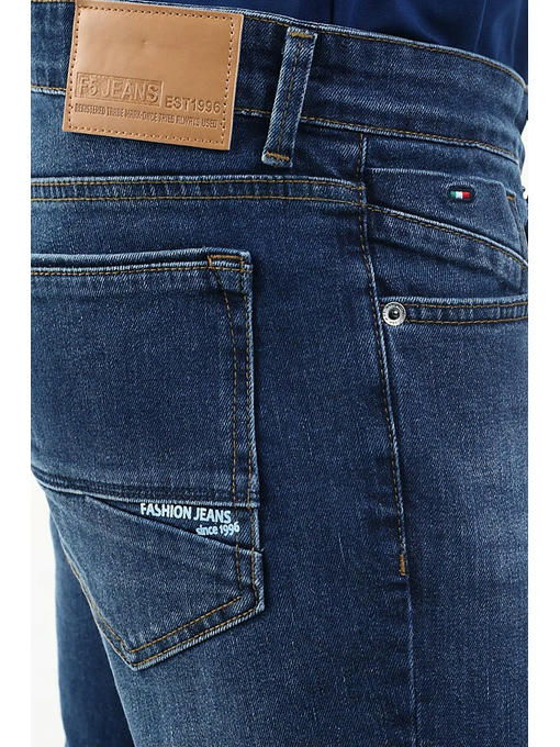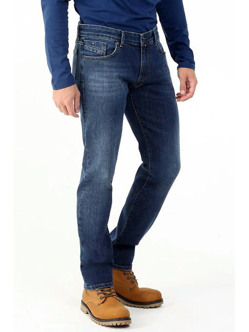 Мужские стильные джинсы с пятью карманами. Увеличенные задние карманы, на правом кармане небольшой принт. Посадка Regular fit (полуоблегающие по бедру). Немного заниженная талия спереди, высокая сзади. Выполнены из слабоэластичной ткани denim comfort stretch. Темная стирка со с потёртостями и “усами”спереди и потёртостями сзади. Параметры указаны для размера 32. Длина внутреннего шва для роста 32 – 81,0 см., для роста 34 – 86 см