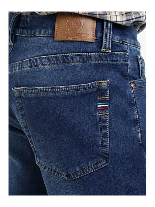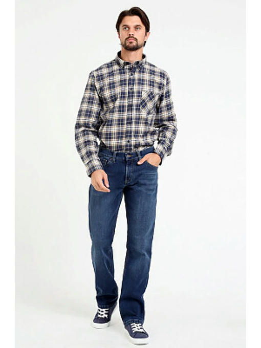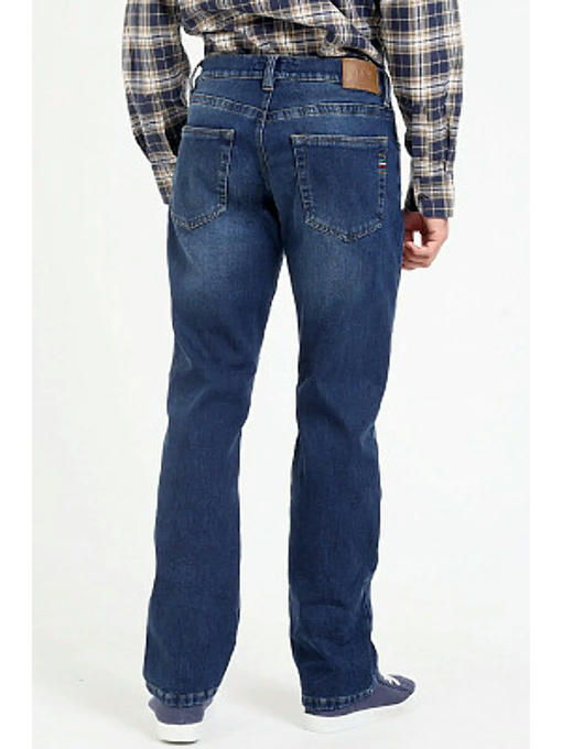 Мужские классические утепленные джинсы с пятью карманами. Посадка Regular fit (полуоблегающие по бедру), средняя высота талии. Застежка на молнии. Немного зауженные к низу. Выполнены из утепленной слабоэластичной ткани Blue denim comfort stretch, к изнаночной ткани прикреплена дополнительная трикотажная ткань (флис) с мягким, шелковистым и приятным на ощупь ворсом. Темная стирка со слабо выраженными потёртостями спереди и сзади. Параметры указаны для размера 32