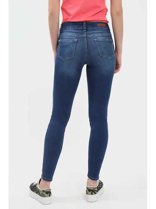 Женские модные джинсы с пятью карманами. Посадка Skinny fit (сильно облегающие по бедру) с высокой талией. Для создания улучшенной посадки на фигуре разработана специальная конструкция задних половинок с двумя вытачками под кокетками . Застежка на молнии. Узкие по низу с небольшим разрезом (4 см) по боковым швам. Выполнены из эластичной ткани denim stretch. Средняя стирка с потертостями и “усами”спереди и потертостями сзади. Параметры указаны для размера 28