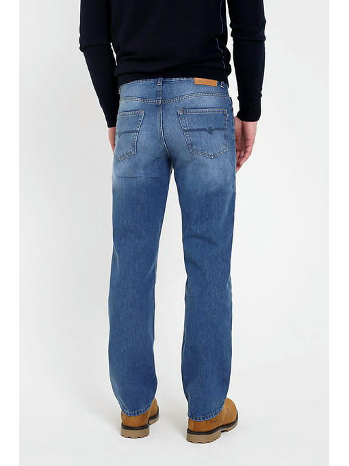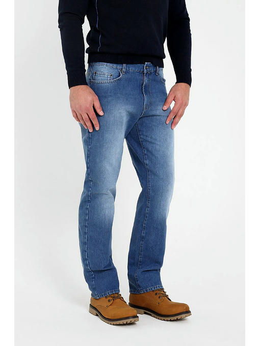 Мужские классические джинсы с пятью карманами. Посадка Regular fit (полуоблегающие по бедру), высокая талия. Застежка на молнии. Немного дополнительно заужены в колене и по низу по сравнению с моделью 0965. Выполнены из ткани denim. Классическая средняя стирка с потёртостями и слабовыраженными “усами” спереди и потёртостями сзади. Параметры указаны для размера 32