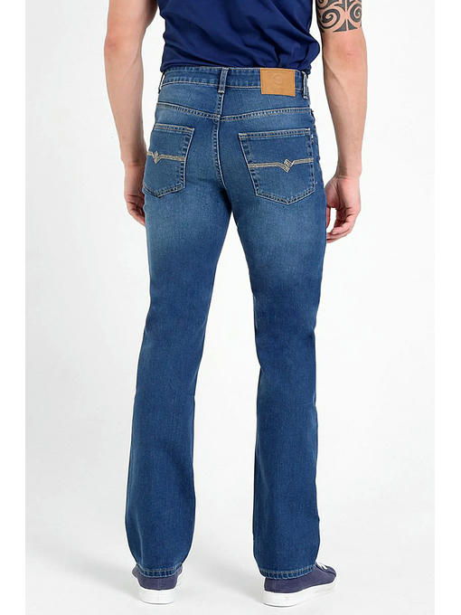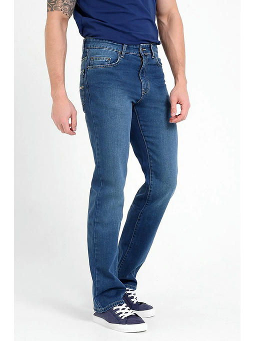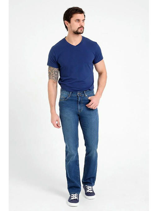 Мужские классические джинсы с пятью карманами. Посадка Regular fit (полуоблегающие по бедру), высокая талия. Застежка на молнии. Немного дополнительно заужены в колене и по низу по сравнению с моделью 0965. Длинна внутреннего шва для роста 32 – 81,5 см. Выполнены из слабоэластичной ткани denim comfort stretch. Средняя стирка с потёртостями спереди и сзади. Параметры указаны для размера 32