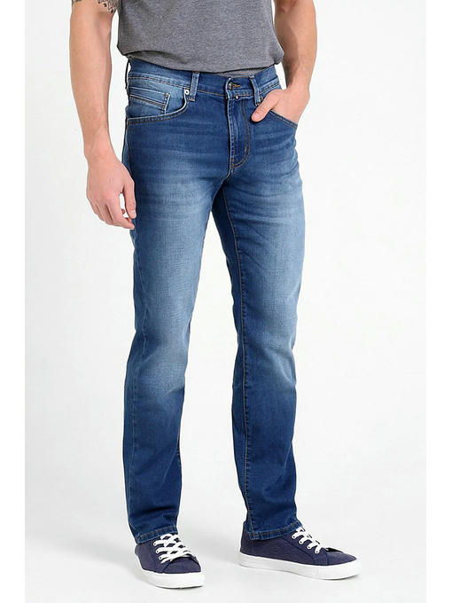 Мужские модные джинсы с пятью карманами. Посадка Regular fit (полуоблегающие по бедру), с высокой талией спереди и сзади. Застежка на молнии. Зауженные к низу. Выполнены из слабоэластичной ткани denim comfort stretch. Средняя стирка с потёртостями и “усами” спереди и сзади. Параметры указаны для размера 32