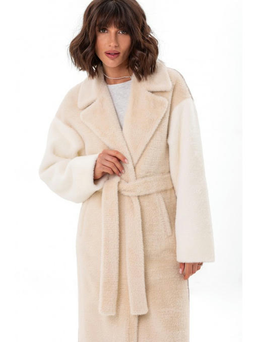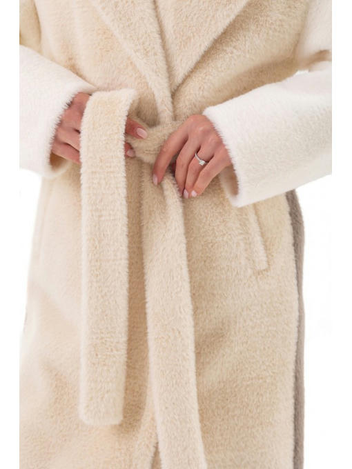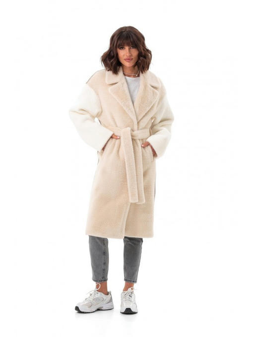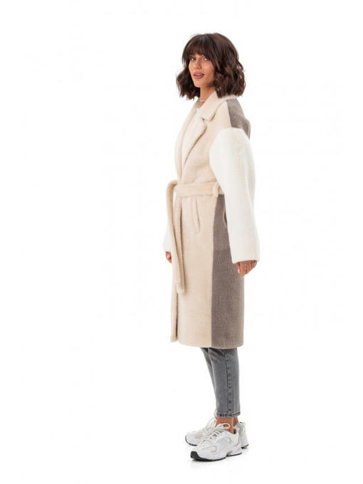 Дизайнерское пальто из экоальпаки теплое, так как утеплено слимтексом! Для изготовления шубки использовано 3 цвета, гармонично сочетающиеся между собой. Спинка – более темная (цвет капучино), лицевая сторона – среднего тона (бежевый). Рукава белого цвета.
