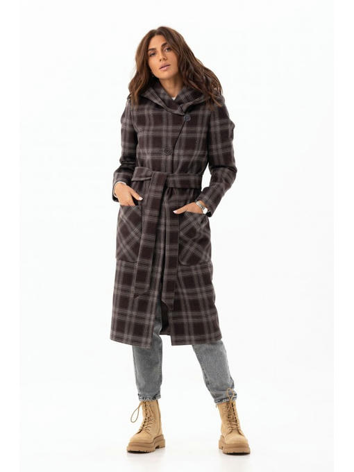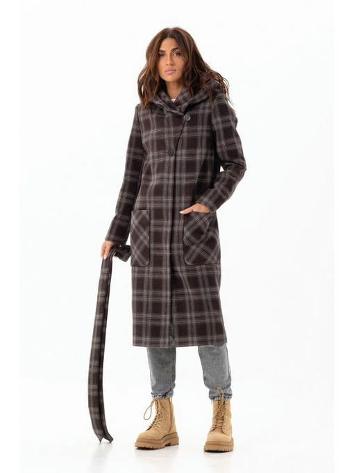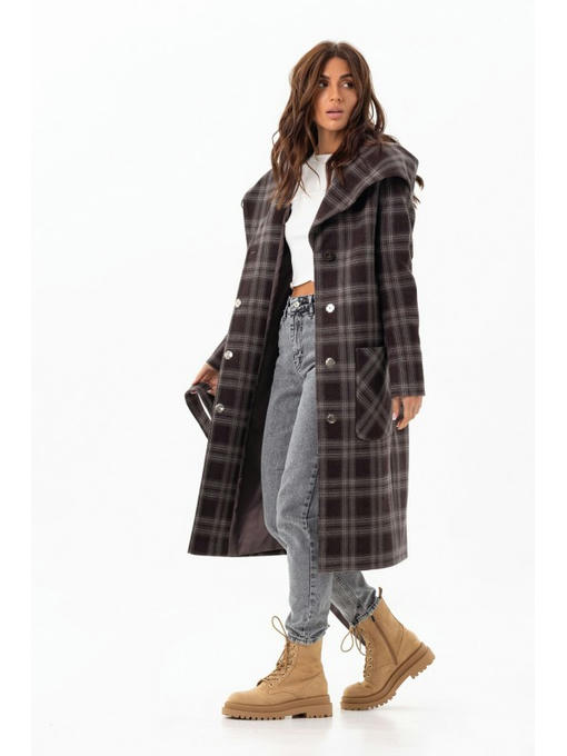 Длинное пальто с капюшоном станет отличным дополнением повседневного гардероба. Демисезонное пальто сделано из темной шерстяной ткани в клеточку.