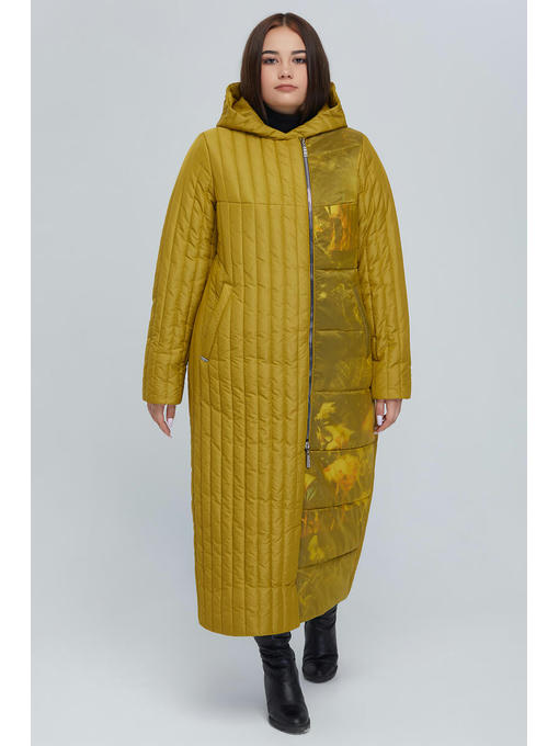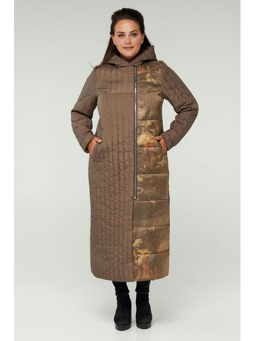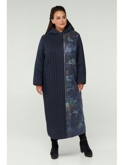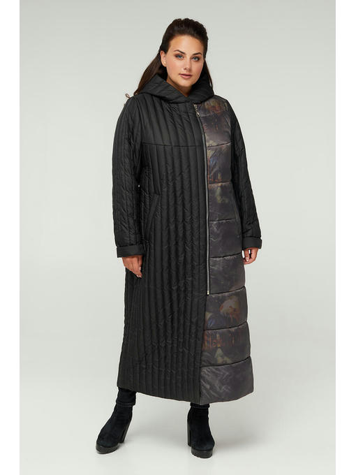 Длинное стеганное пальто из плащевой ткани. Вертикальная стежка визуально стройнит. Левая полочка выполнена из принтованной плащевки. Застегивается на молнию, смещенную влево, и потайные кнопки внизу. На спинке шлица на кнопке. Есть карманы и несъемный капюшон. Утеплитель силикон премиум 100. Подкладка-нейлон.