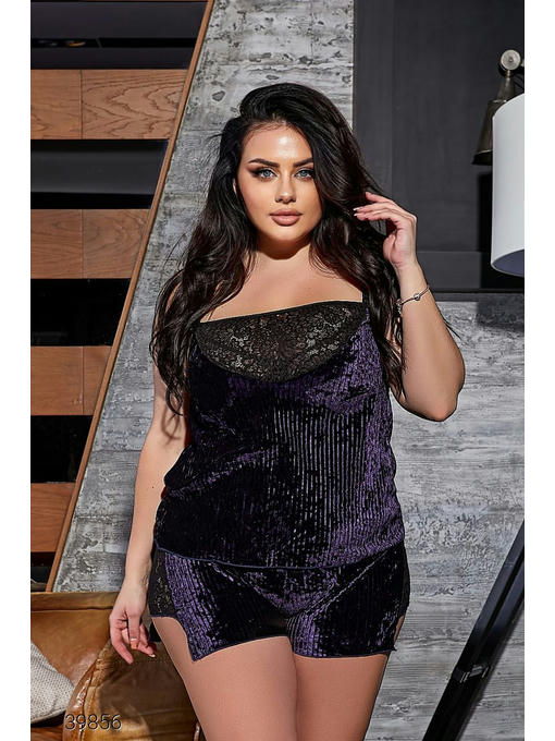 Домашний комплект. Майка на регулируемых бретелях. Шорты на резинке, сбоку лампас выполнен из плотного кружева. Ткань: плотный бархат плиссе.