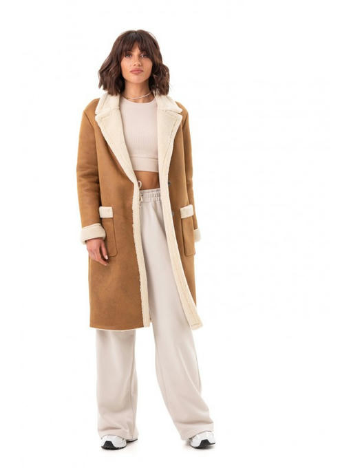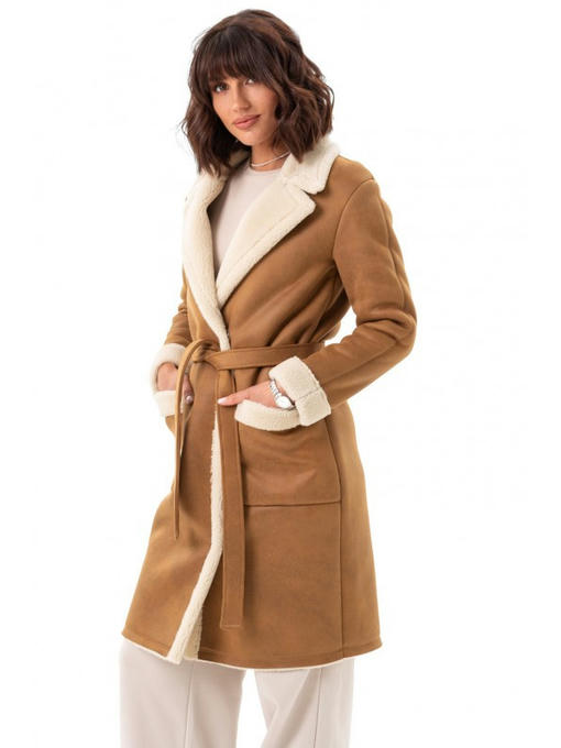 Повседневная дубленка средней длины. Отложной воротник. Втачные рукава. Эффектно выглядит под пояс.