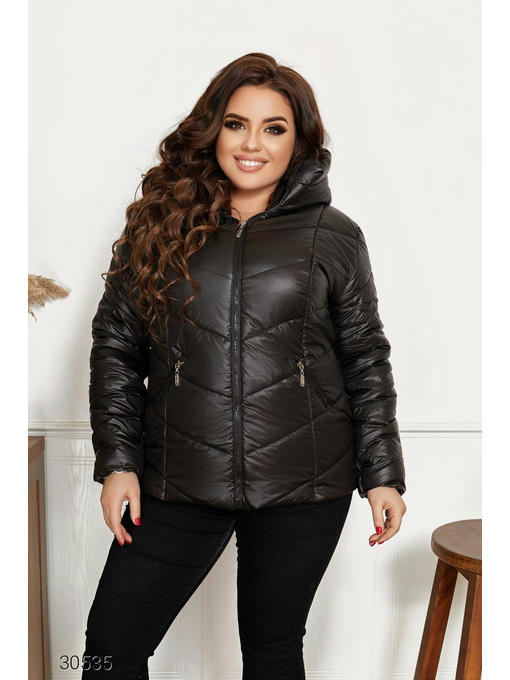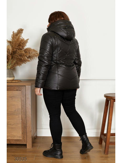 Куртка из плащевки, утеплена силиконом. Высокий ворот – стойка, объёмный капюшон, заниженная линия плеч. Застёжка и боковые карманы на молнии, есть подкладка.