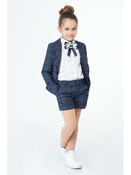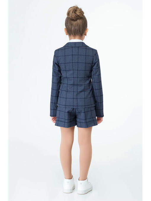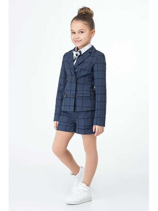 Стильный двубортный жакет для девочки из поливискозной ткани с рисунком в клетку. Жакет на поливискозной подкладки. Жакет полуприлегающего силуэта, с воротником, с V-образным вырезом горловины, со сквозной застежкой на петли и пуговицы. Рукава длинные. На жакете выполнены рельефы, обеспечивающие отличную посадку по фигуре. По переду имеются карманы с клапанами. Очень стильный модный жакет для модных школьниц