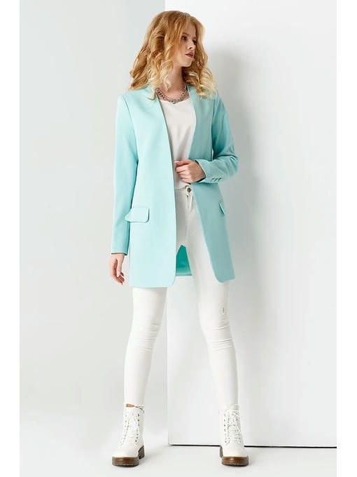 Стильный модный жакет. Это повседневный удобный и практичный жакет, который отлично сочетается как с джинсами, так и с брюками. Жакет удлиненный, без застежки, рукава длинные. По переду имеются карманы с клапаном. Жакет на подкладки