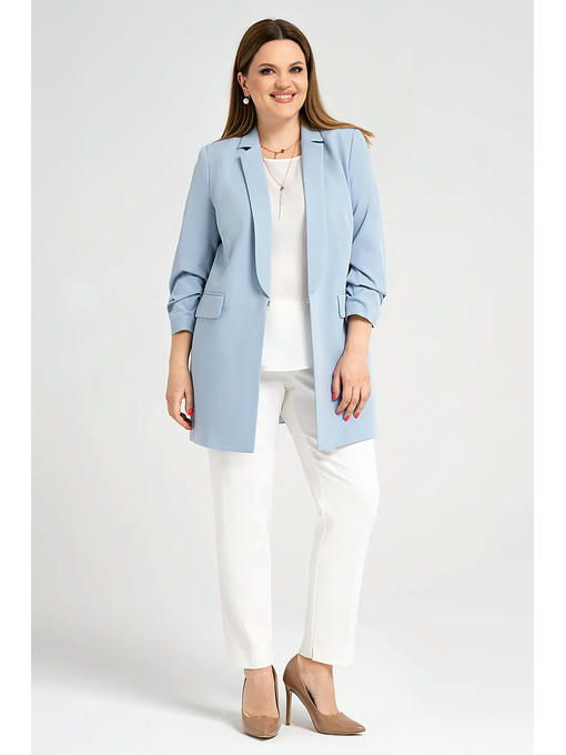 Стильный удлиненный жакет с укороченными рукавами с застежкой на потайной крючок по переду. Жакет с воротником и лацканами, застежка встык. По бокам рельефы, по переду от рельефа имеется нагрудная выточка, все это обеспечивает отличную посадку по фигуре. По бокам карманы с клапаном в рамку. Жакет на поливискозной подкладки. Такой жакет отлично сочетается как с брюками, так и отлично подойдет в комплекте к платью