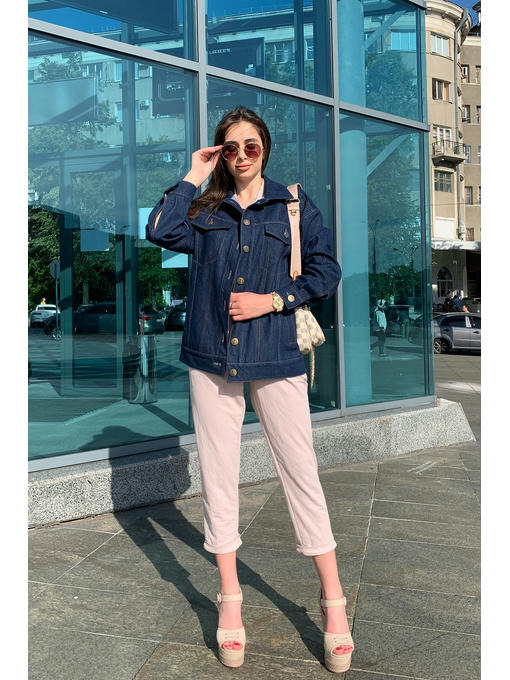 Прямой удлиненный жакет oversize. Длина чуть ниже середины бедра. Застегивается на джинсовые металлические пуговицы. Отложной воротник. Рукав спущенный, на манжете,застегивается на пуговицу. Карманы на груди внутренние с клапаном и в бочке карманы листочки. пПо низу жакета отрезной пояс с декоративными патами по спинке. Стильный актуальный джинсовый жакет является трендом не первый сезон.Идеально сочетается и с романтичным образом и с любимыми и комфортными спортивными вещами.