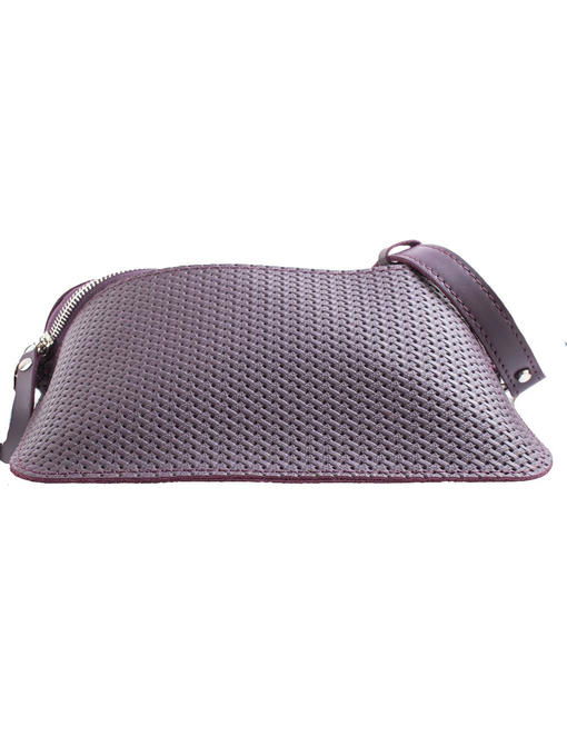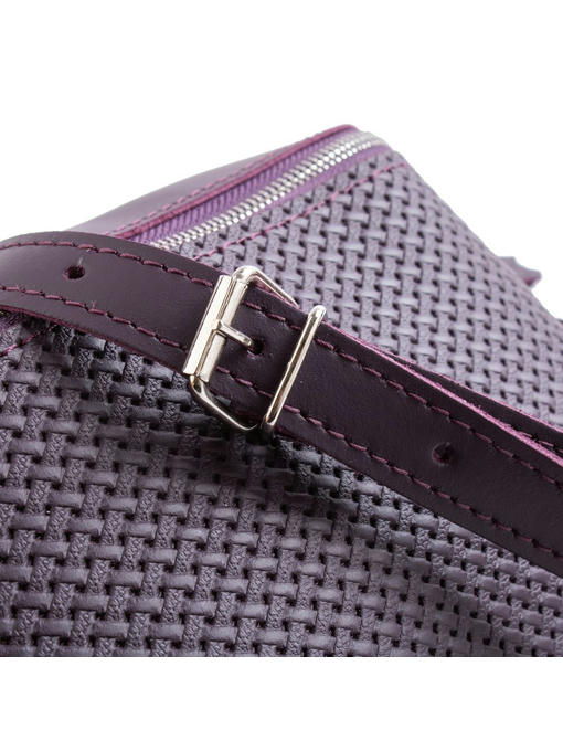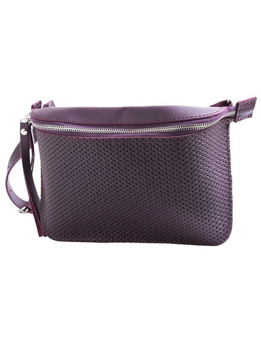 Форма, цвет, дизайн этой сумочки помогут Вам создать немало стильных и оригинальных образов. Аксессуар для ношения на поясе конструктивно выделяется в ряду привычных изделий из этого модельного ряда. Плоская тыльная сторона, широкое сверху и уходящее в формат конверта основное отделение, плавность цельнокроеной с боками лицевой стороны – изделие будет заметной деталью в гардеробе. Фиолетовый цвет добротной натуральной кожи великолепен, фактурные детали с имитацией плетения – украшение сумки. Фурнитура под серебро дополняет ансамбль яркими штрихами. Молния с металлическими зубцами надёжна, поясной ремень можно продеть в шлевки брюк или другой одежды