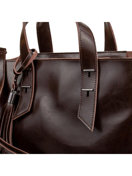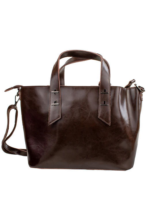 Серый оттенок натуральной кожи, из которой изготовлена эта сумка, настолько универсальный, что подходит и к базовому гардеробу, и к любым ансамблям. Модель надёжна, она даже выглядит основательно и серьёзно. Широкая снизу и по бокам, устойчивая, она вмещает повседневно-рабочие вещи, в том числе бумаги А4 формата. Крепкие ручки, дно с металлическими защитными ножками, пристежной ремень – устройство аксессуара не сложное и практичное. Удачным решением служит вкладыш-косметичка. Его можно носить отдельно как клатч, пристегнув ремешок, или использоваться для косметики, а можно держать его внутри основной сумочки для разных мелких вещей