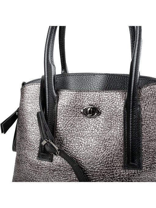 Стильную и прочную сумку для деловой женщины предлагает торговая марка DESISAN. Серебристый модный цвет добротной натуральной кожи делает модель эффектной, вместе с тем она сохраняет высокую универсальность по отношению к другим предметам гардероба. Сдержанный блеск соединяется с приятно-фактурной поверхностью, гармонично дополняется чёрными деталями. Чёрно-серебристый аксессуар выглядит отлично, модная цветовая гамма делает традиционную форму современной и очень привлекательной. Плавные очертания изделия уравновешиваются прямыми линиями длинных вертикальных креплений ручек, плотным устойчивым дном. Расположение наружных карманов добавляет оригинальности сумочке, способствует комфортному обращению с повседневной поклажей