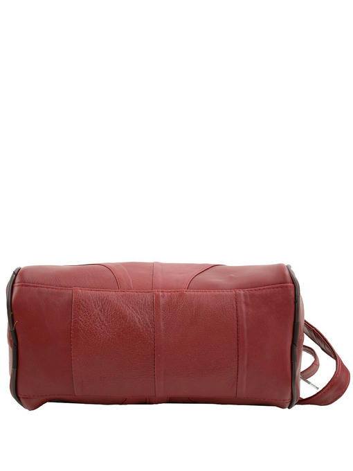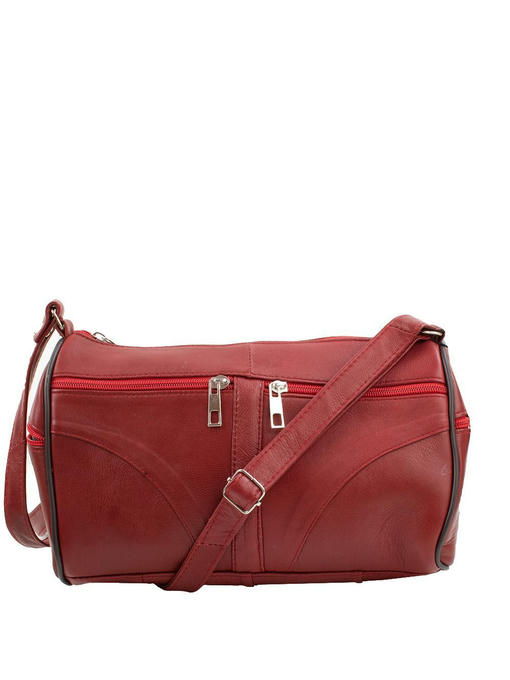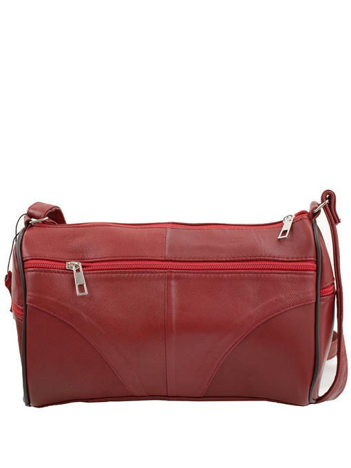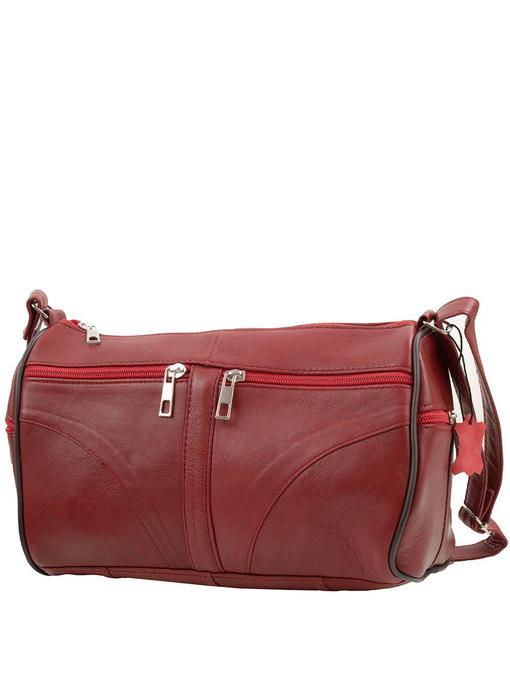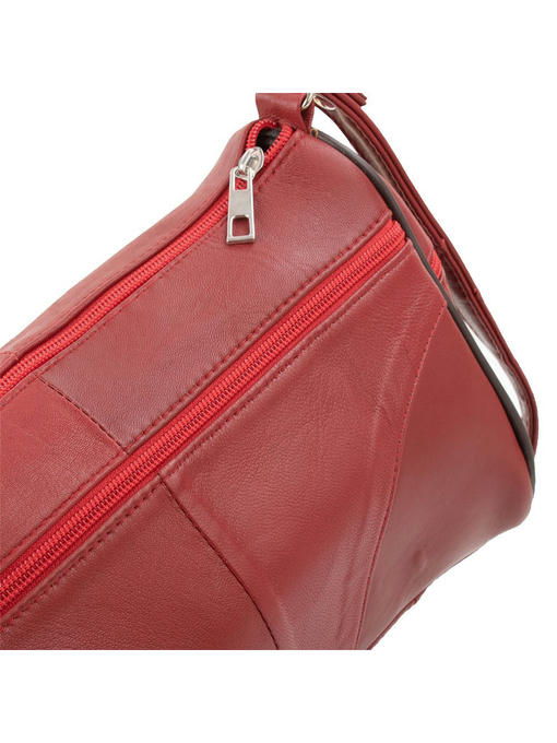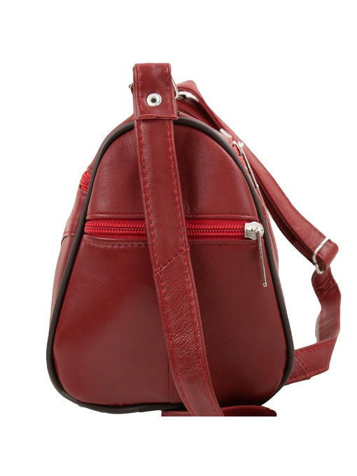 С такой сумочкой у женщины всегда будет достаточно места для размещения повседневно необходимых вещей, среди которых, как обычно, много мелочёвки. Аксессуар торговой марки TUNONA очень удобен, здесь так много карманов, особенно наружных, что это не может не радовать. Сумка-багет модной горизонтально-продолговатой формы, с плечевым ремнём изготовлена из эластичной и приятной на ощупь натуральной кожи. Беспроигрышный вариант для гардероба в любое время года! Красный цвет основного материала дополняется более ярким оттенком вшитых молний и светло-серебристыми металлическими частями фурнитуры. Отделочные строчки проложены точно по краю каждой детали, внешние, наиболее подверженные износу места усилены плотной окантовкой