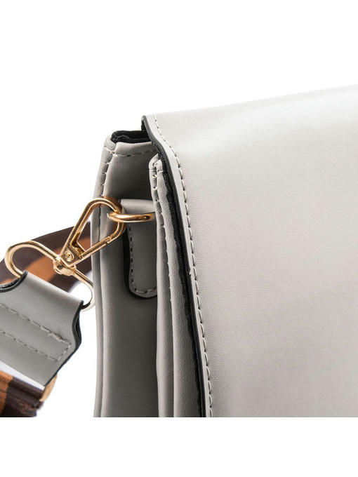 Клатч с широким тканевым ремнем в полоску выглядит интересно. Такое решение делает однотонную, основанную на классических образцах модель оригинальный, добавляет в образ спортивные нотки. Ремешок съёмный, так что Вы сможете сполна использовать стилистические возможности представленного торговой маркой VALIRIA FASHION аксессуара. Светлая серая сумочка лаконична, её дополняют не только коричневые оттенки ремня, но и ярко-золотистые детали фурнитуры. Клапан закрывает всю лицевую сторону и точно повторяет контуры изделия. Форма здесь обычная прямоугольная, разделение на два отсека формирует соответствующий вид сбоку и снизу. Закрывается сумка-клатч магнитной кнопкой, а это значит, что получить доступ к содержимому владелица всегда сможет быстро в любой обстановке