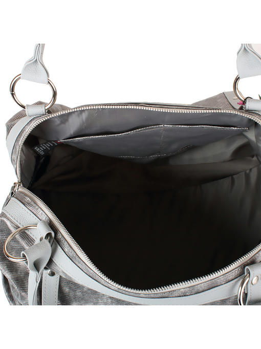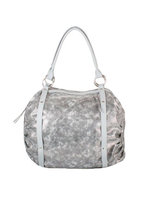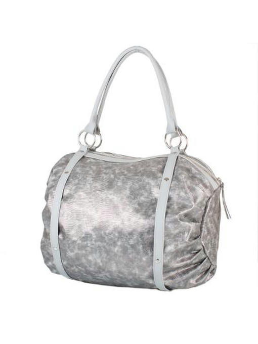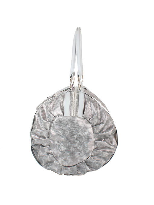 Повседневно-дорожная модная сумочка – отличный вариант для женщин, которые активны и много передвигаются по рабочим и личным делам. Краткосрочные командировки, поездки разными видами транспорта, фитнес и бассейн, сауна – эти задачи и множество других из Вашего жизненного распорядка поможет решить аксессуар, представленный здесь торговой маркой ЛАСКАРА из Греции. Серо-серебристый, ноский и эластичный фактурный кожзам умело использовали дизайнеры бренда, чтобы создать форму горизонтального объемистого бочонка с глубокими складками-защипами, идущими по кругу на боковых частях. Детали из однотонного материала участвуют в создании актуально-универсального цветового ансамбля и хорошо укрепляют все стороны, верх, ручки