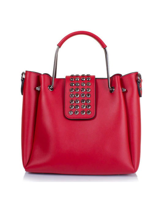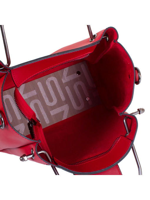 Модерновая, яркая, интересная – эта женская сумочка запросто сделает образ эффектным и стильным. Модель выдержана в красном цвете, и он служит здесь фоном для умелого декора и самобытной конструкции. Каждый штрих – составляющая продуманного ансамбля: металлические многочисленные детали, фурнитура перекликаются с окрашенными черными срезами плотного материала. Гладкая матовая поверхность его подчеркивает мягкость формы, ее основательность и легкость и красиво отражает падающий свет. Вкладыш-косметичка в комплекте повышает практичность и без того вместительной и удобной сумки, которую можно носить и на ремне (он широкий, пристегивается надежными карабинами)