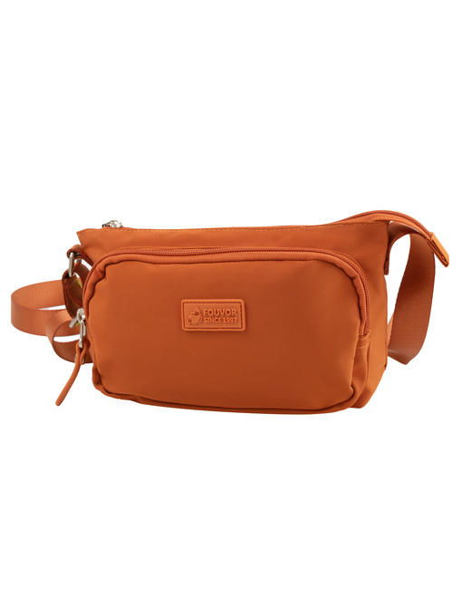 Внешние размеры сумки (X*Y*Z): 22*14*5 см. Цвет: оранжевый. Цвет фурнитуры: серебро. Материал изделия: ткань Оксфорд (полиэстер). Количество основных отделений: 1. Внутри основного отделения есть 1 прорезной карман на молнии и 1 открытый накладной карман. На лицевой стороне есть 1 большой накладной карман на молнии. На тыльной стороне сумки расположен 1 прорезной карман на молнии.