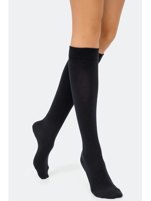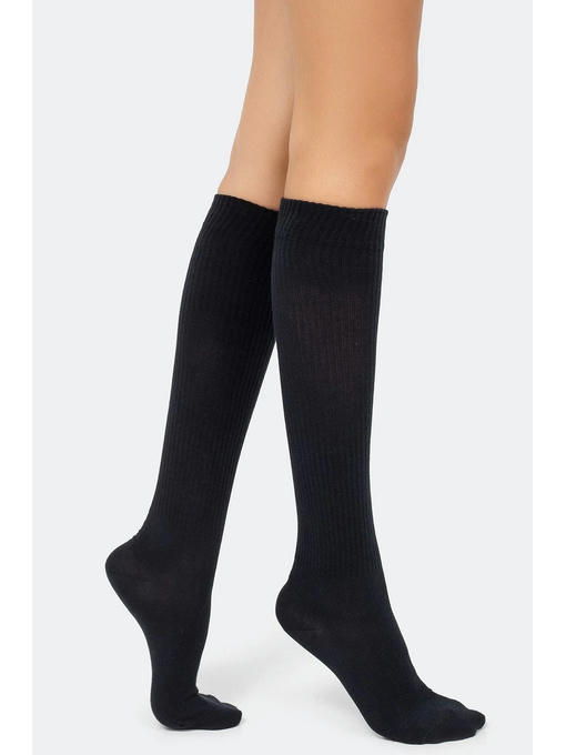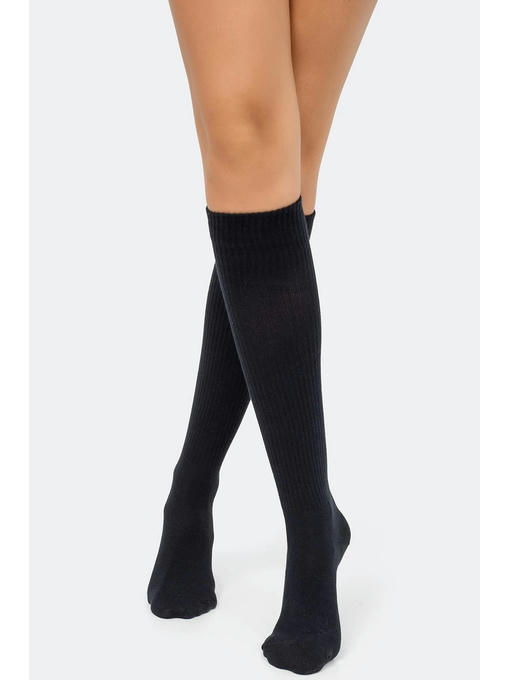 Высокое содержание хлопка позволяет коже дышать, добавление синтетических нитей в состав увеличивает прочность женских высоких носков. Гольфы не сползают, не скатываются и не теряют форму.
