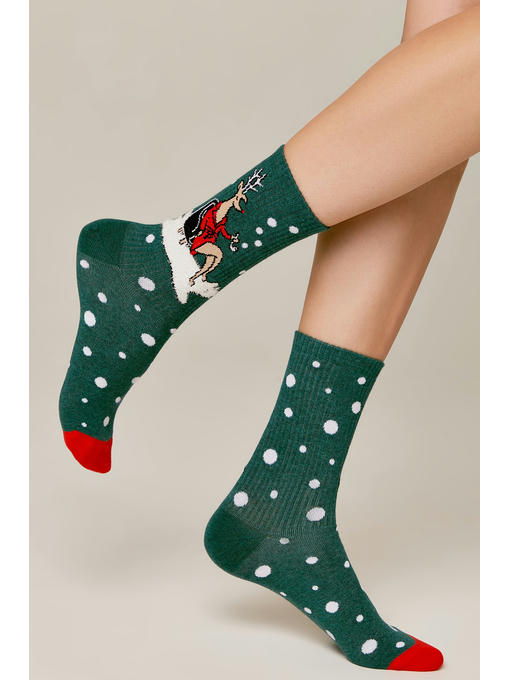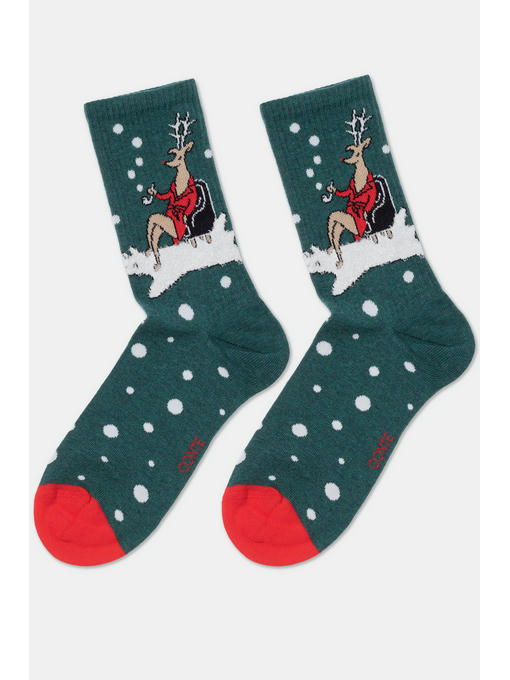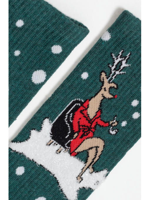 Бирюзовые носки украшены рисунком Олень – яркая деталь праздничного образа.