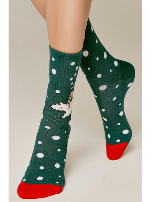 Новогодняя пара женских удлиненных носочков связана из пряжи с высоким содержанием хлопка. Благодаря безопасным синтетическим добавкам носки не теряют форму и не сползают с ноги, отличаются прочностью и позволяют коже ног дышать.