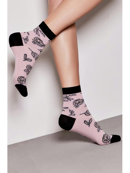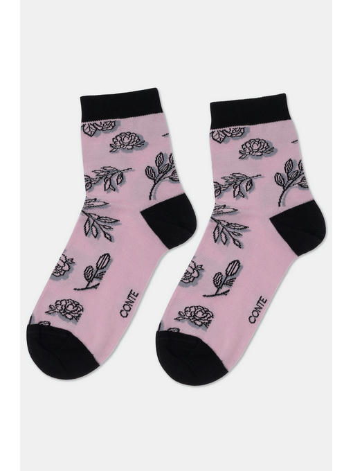Женские классические носки с цветочным рисунком выполнены из натуральной хлопковой нити с добавлением синтетических волокон для лучшего облегания и увеличения прочности. Удлиненные носочки выполнены в пепельно-розовом цвете, мысок, пятка и резинка одного цвета.