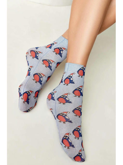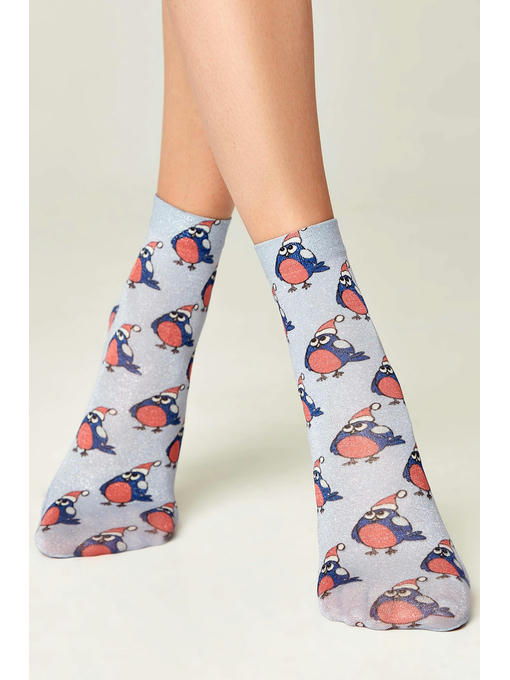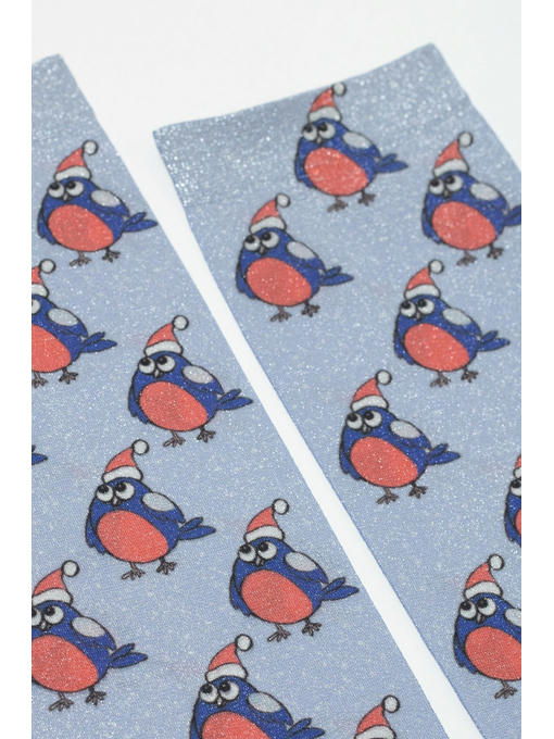 Женские носки с новогодним принтом Снегири. Плотные, эластичные носки 50 ден, с использованием металлизированной нити люрекс.