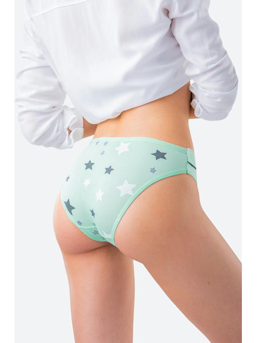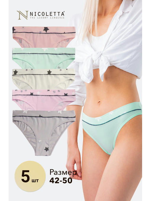 Хлопковая ткань приятная к телу, очень мягкая и нежная. Благодаря добавлению эластана трусики женские плотно прилегают к телу, даря отличную посадку по фигуре. В наборе представлены трусики в нежных пастельных оттенках: розовый, беж, серый, персиковый и ментол, принт звезды декорирован блестками.