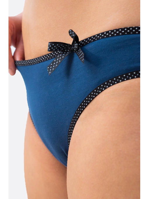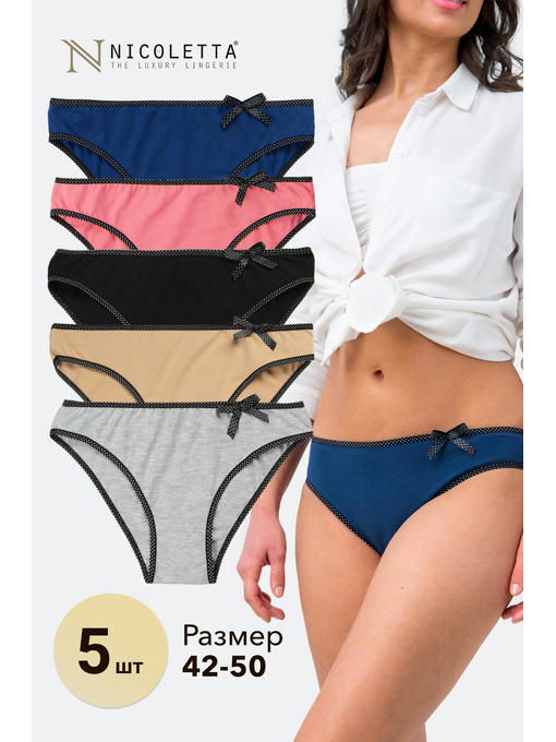 В наборе представлены трусики в разной цветовой гамме, декорированы поясом и бейкой в горошек и маленьким бантиком. Трусы слипы женские на каждый день, в комплекте 5 шт.