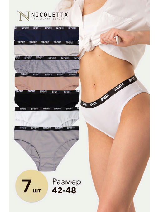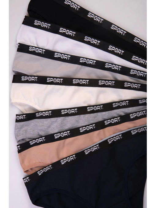 В наборе-недельке представлены трусики в базовых оттенках: черные, серые, синие, белые, молочные, серые меланжевые и бежевые слипы. Резинка украшена контрастной надписью Sport.