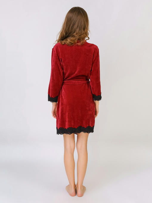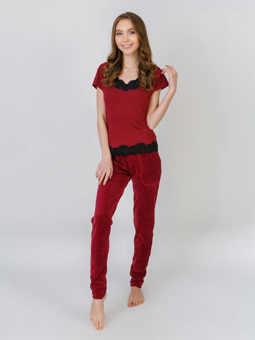 Женский домашний комплект из мраморного велюра, бордовый с черным кружевом. Комплект тройка. Халат и пижама с брюками. Очень удобные, из ткани высокого качества. Не теряет цвет и форму после стирки.