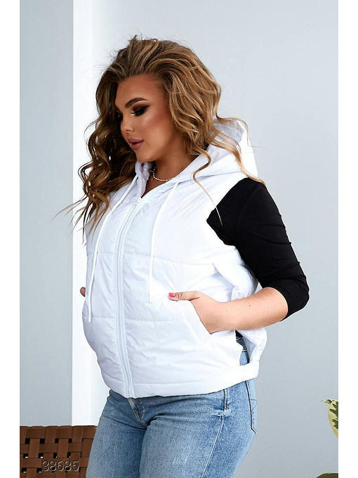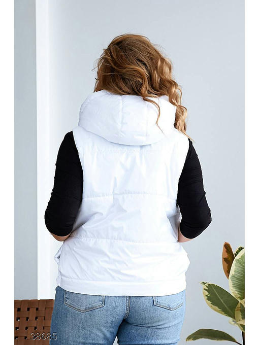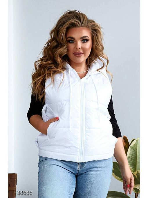 Женский жилет большого размера с капюшоном. Капюшон глубокий с протяжками, есть карманы. Дополнительно по бокам резиночка. Ткань: стеганая плащевка с подкладом, утеплитель силикон 150 г/м2.