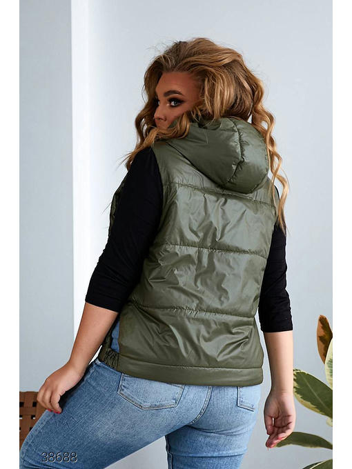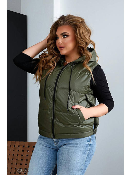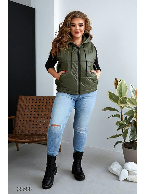 Женский жилет большого размера с капюшоном. Капюшон глубокий с протяжками, есть карманы. Дополнительно по бокам резиночка. Ткань: стеганая плащевка с подкладом, утеплитель силикон 150 г/м2.