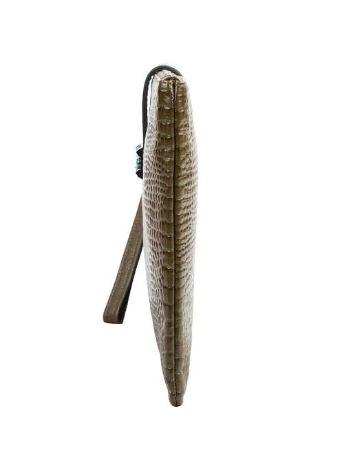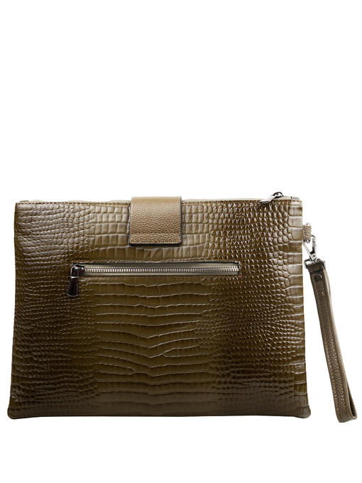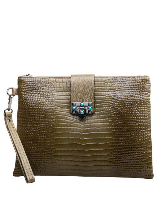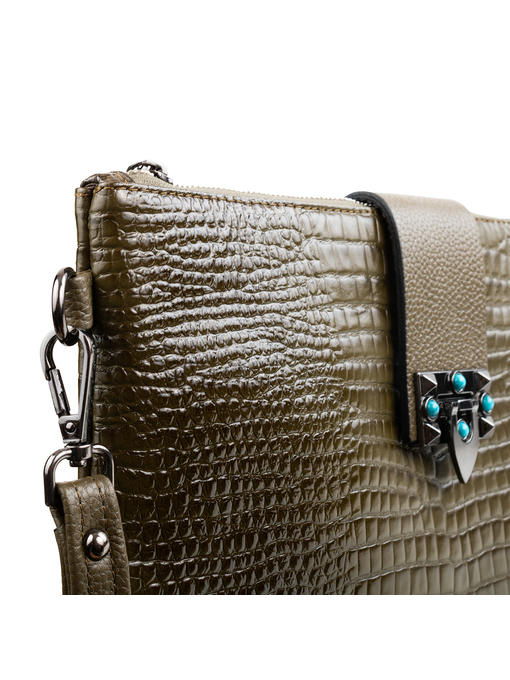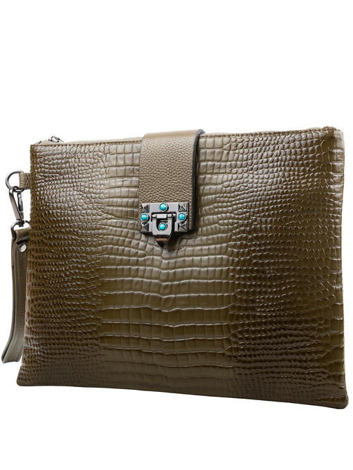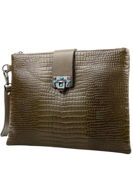 Оригинальная вещица – этот клатч торговой марки DESISAN! Плоская, немалого формата форма приобретает здесь самобытность благодаря тиснёной под рептилию натуральной коже цвета хаки. Такой вариант не часто встретишь в женском гардеробе. Многое для формирования самобытного образа «делает» механическая застёжка на клапане, который закрывает вход в основное отделение в дополнение к молнии. Не даром дизайнеры поместили её в центр – она детализирует ансамбль и добавляет в него нежность бирюзы, фигурные линии и фактурные элементы. Пристежной кистевой ремешок-ручка поможет Вам выбирать тот или иной стиль в ношении и обращении с аксессуаром. В такую сумочку поместится вся традиционная мелочёвка, документы, планшет, смартфон и другие подобные предметы